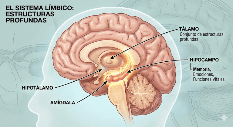 Principalmente el sistema límbico, y en especial la amígdala, es quien se encarga de gestionar nuestras emociones. Esta región organiza nuestras reacciones emocionales —como el miedo, la alegría o la ira— y las conecta con los recuerdos que almacenamos.